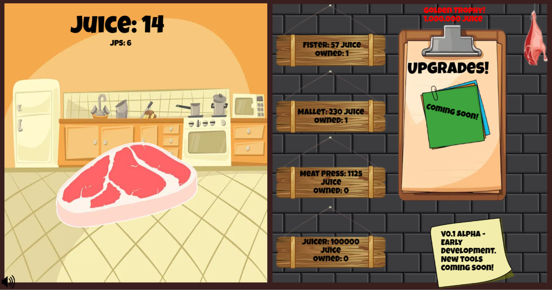 An Idle Clicker game for you to build a meat beating empire. Buy Tools to help you beat and let them do the work for you. How much juice can you get?